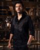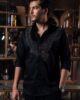 This black shirt features a carefully designed motif that drapes gracefully over the body. Hand-embroidered with antique beads, the detailing adds timeless elegance and subtle texture to the silhouette.